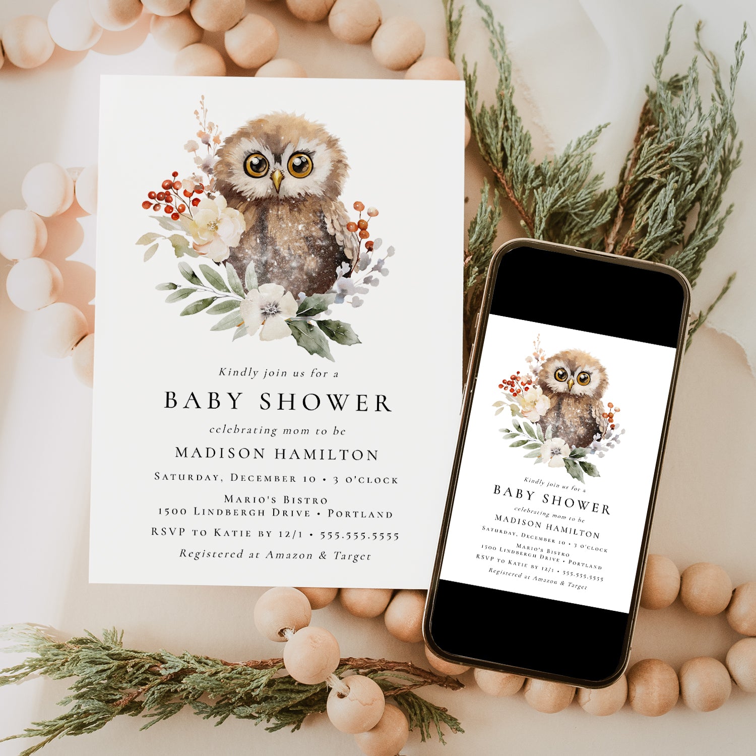 Invite guests to celebrate the mommy-to-be with this adorable winter baby owl baby shower invitation template. The design showcases a charming watercolor illustration of a baby owl nestled among winter white flowers, red holly berries, and lush green leaves, creating a cozy woodland winter theme. Personalize the invitation with the mother-to-be’s name and shower details to make it perfectly tailored for the celebration. The back features a matching winter floral bouquet, completing the coordinated look.