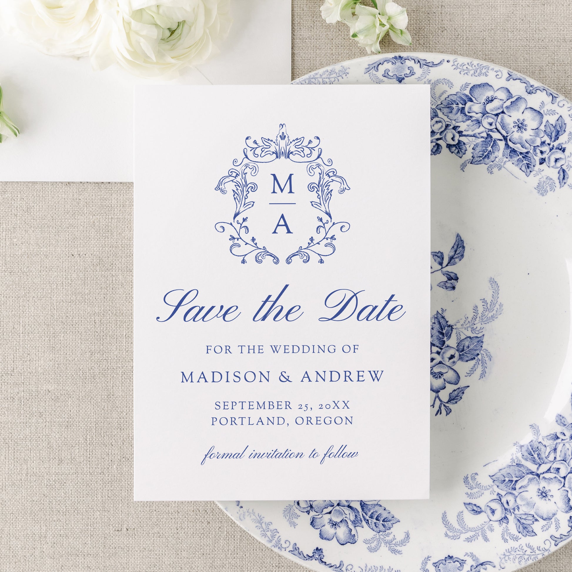 Elegant Blue Chinoiserie Monogram Crest Wedding Save The Date Card | Corjl Template