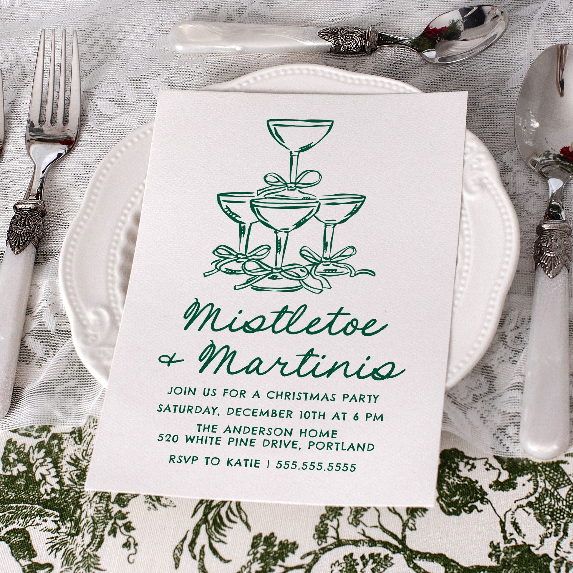 Elegant Mistletoe and Martinis Green Christmas Party Invitation | Corjl Template