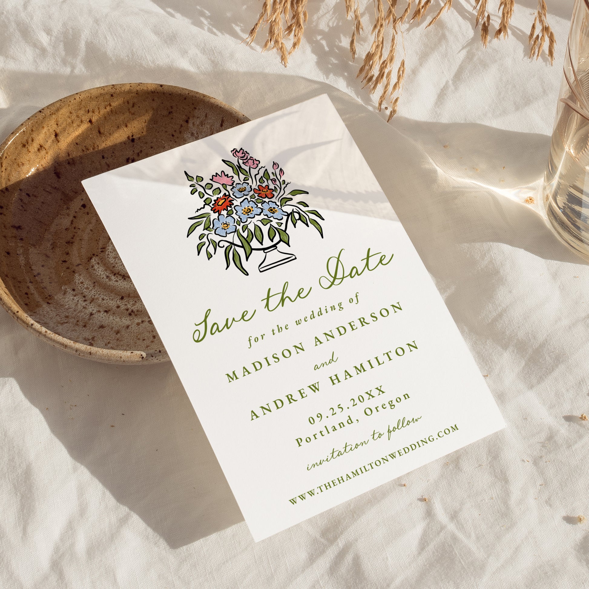 Capture the beauty of Tuscany with this elegant save the date. Warm sunset hues and Mediterranean blues frame hand-illustrated florals, while a green script font reads "Save the Date." Your names, wedding date, location, and website are personalized in classic, timeless type. The back of the card showcases a full-bleed vertical photo, adding a personal touch to this perfect invitation for destination weddings or garden celebrations.