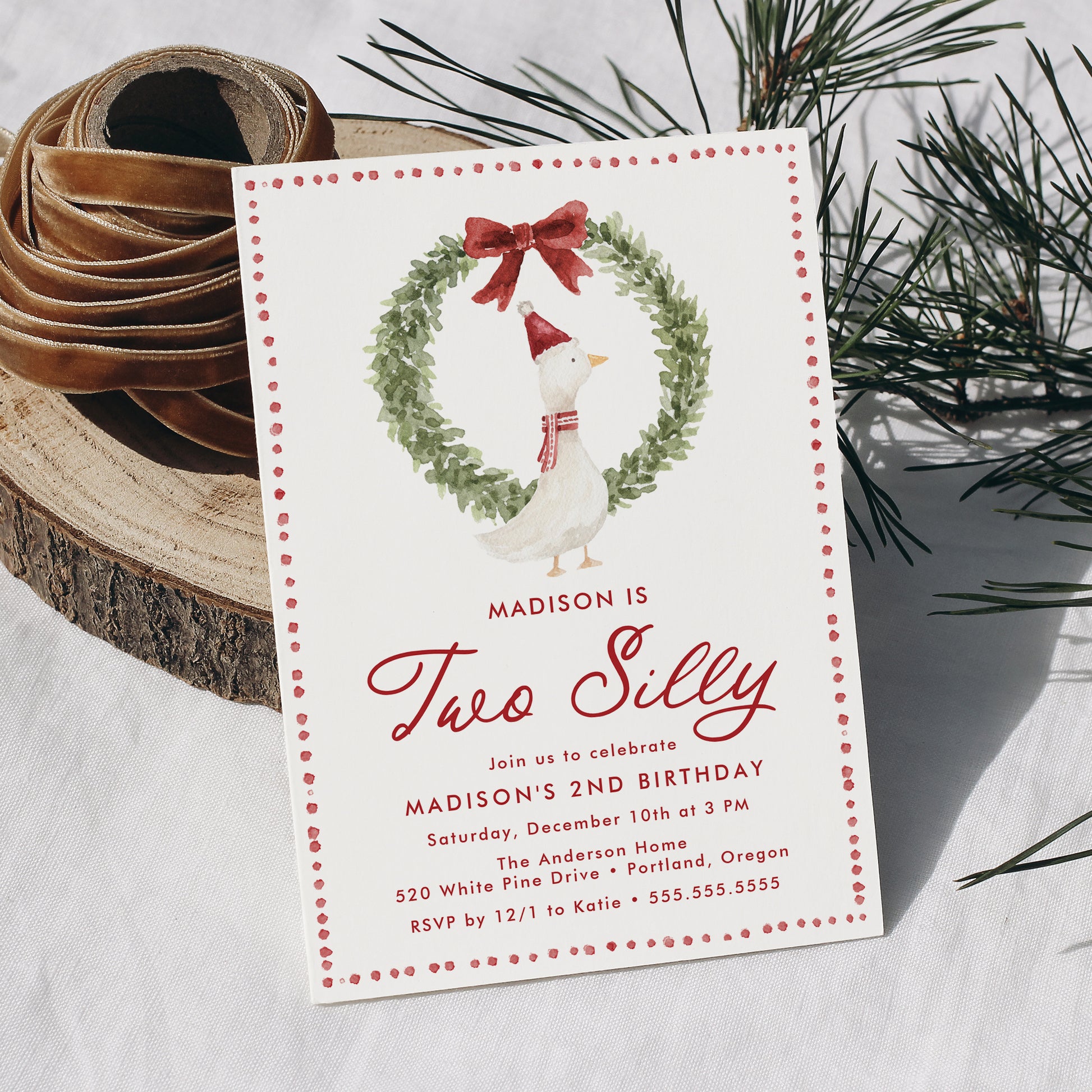 Two Silly Goose Christmas Red Bow 2nd Birthday Invitation | Corjl Template