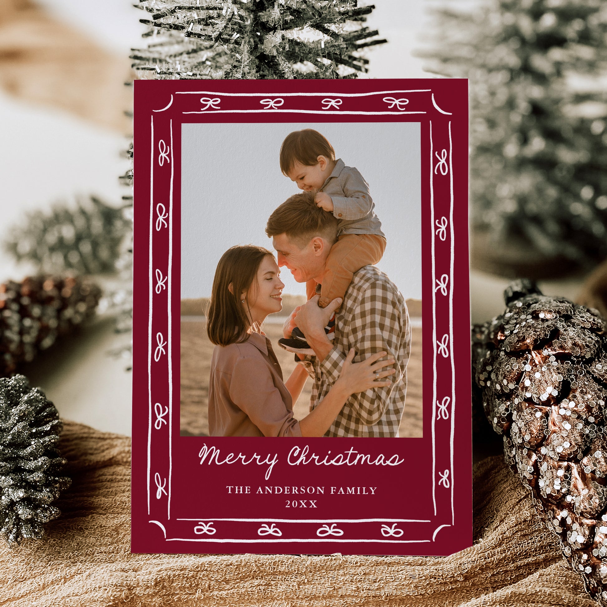 Share warm holiday wishes with this whimsical hand-drawn white bow Christmas photo card template. The design features your vertical photo framed by a simple yet elegant white bow border on a rich cranberry background. “Merry Christmas” appears below in whimsical handwritten white script, with your family name and year shown underneath. The inviting color palette and charming hand-drawn details create a cozy yet refined design. The back includes a second photo with space beneath for your personal message, making it perfect for sending heartfelt greetings this holiday season.