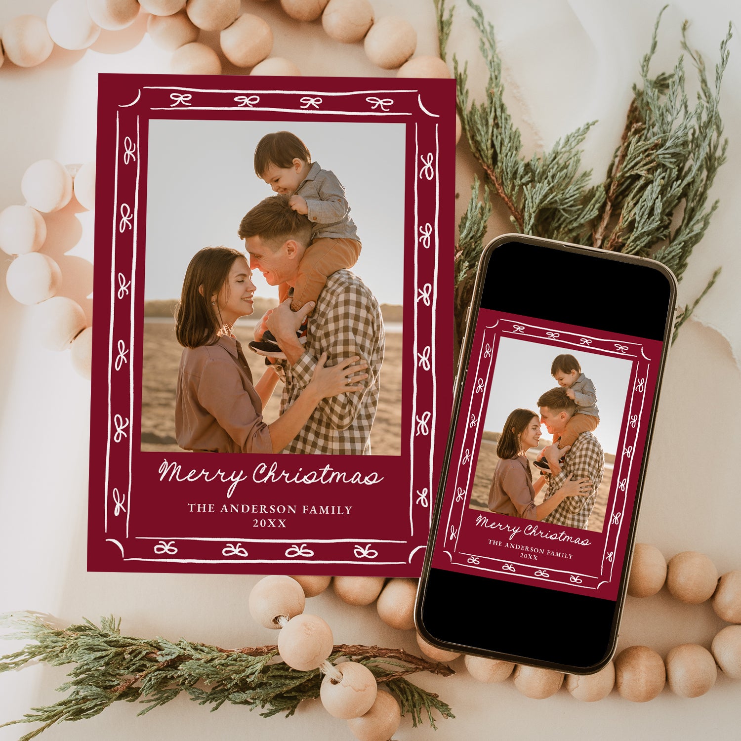 Whimsical Hand-Drawn Bow Frame Cranberry 2 Photo Holiday Card | Corjl Template