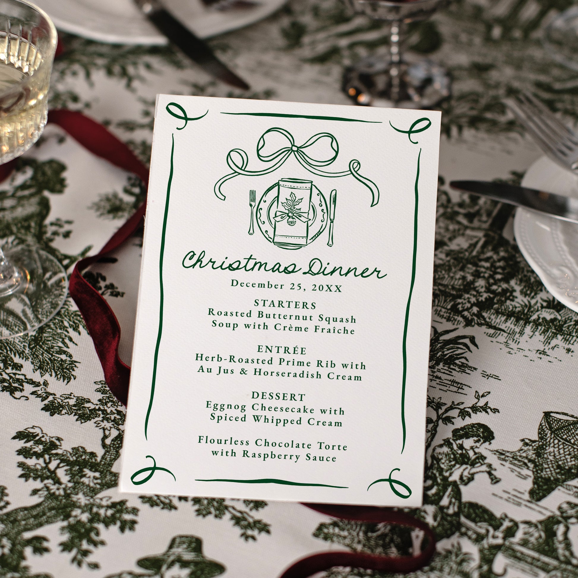 Whimsical Hand-Drawn Green Bow Christmas Dinner Menu | Corjl Template