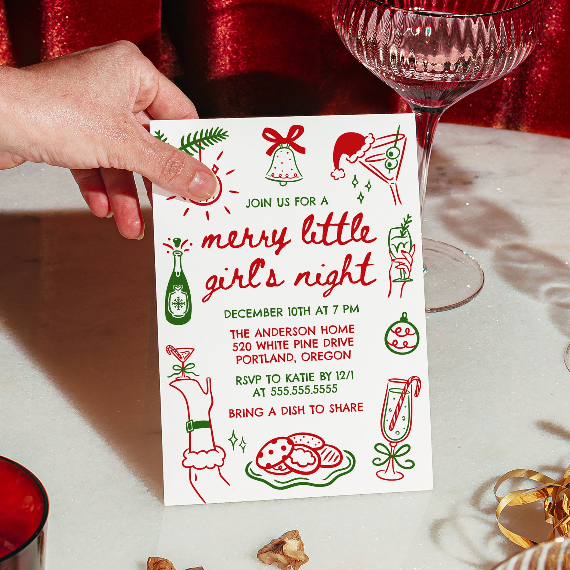 Celebrate the season with this whimsical Christmas party invitation template featuring “Merry Little Girl’s Night” in bold, handwritten red script. Playful red and green illustrations include a disco ball on a pine bough, bell, martini glass with a Santa hat, a woman’s hand holding a holiday drink, ornament, champagne with a candy cane, cookies, and a high-heeled Santa boot balancing a martini. Your party details appear in coordinating red and green lettering—perfect for girls’ night gatherings, Secret Santa exchanges, or fun holiday parties with friends.