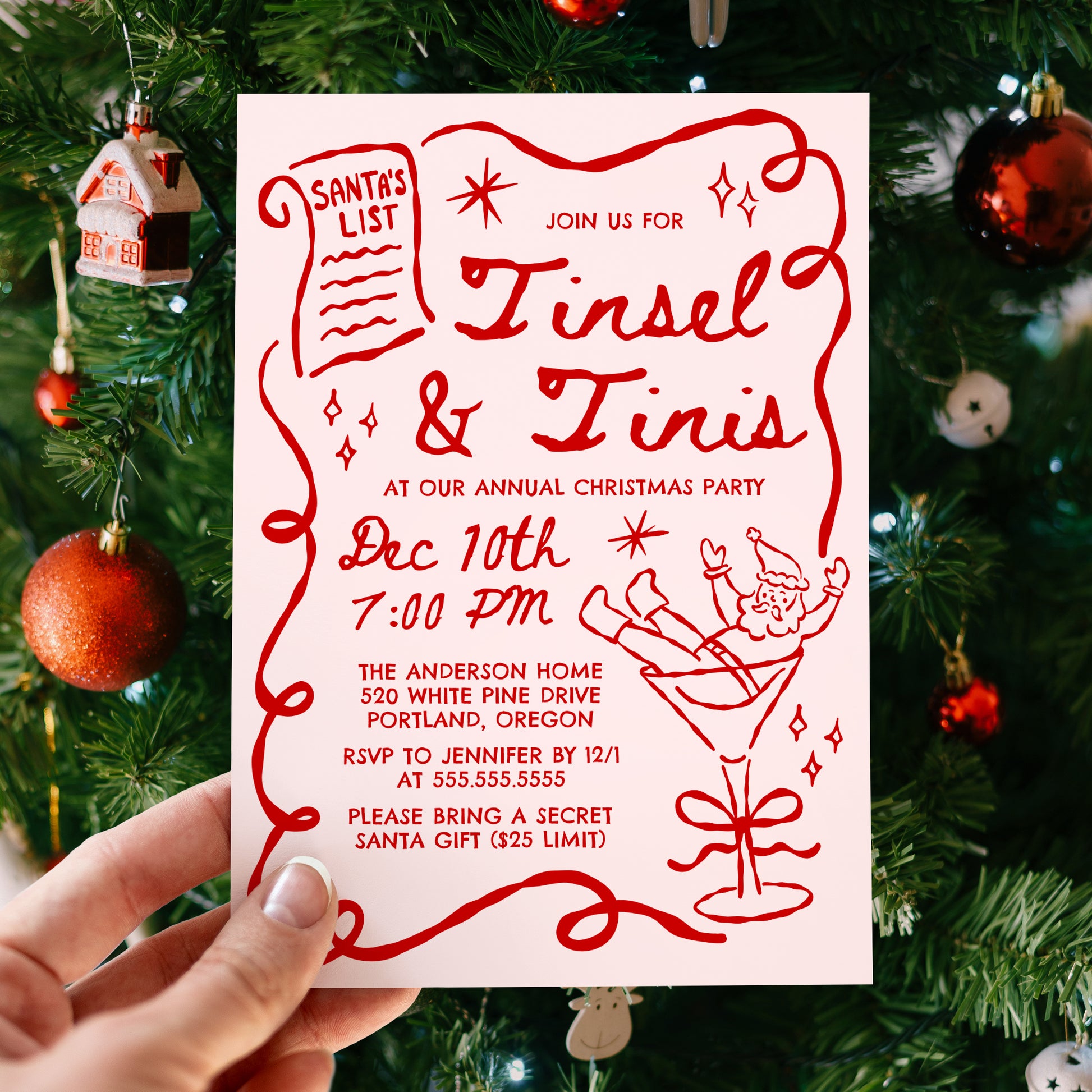 Celebrate the season with this whimsical “Tinsel & Tinis” Christmas party invitation template. The design features hand-drawn red illustrations and lettering on a light pink background, showcasing Santa lounging in a martini glass beside his list, surrounded by stars and a flowing ribbon frame around your event details. “Tinsel & Tinis” appears in a playful handwritten script for a modern, trendy twist on a classic Christmas look. Perfect for holiday cocktail parties, Secret Santa gatherings, or festive soirées with friends.