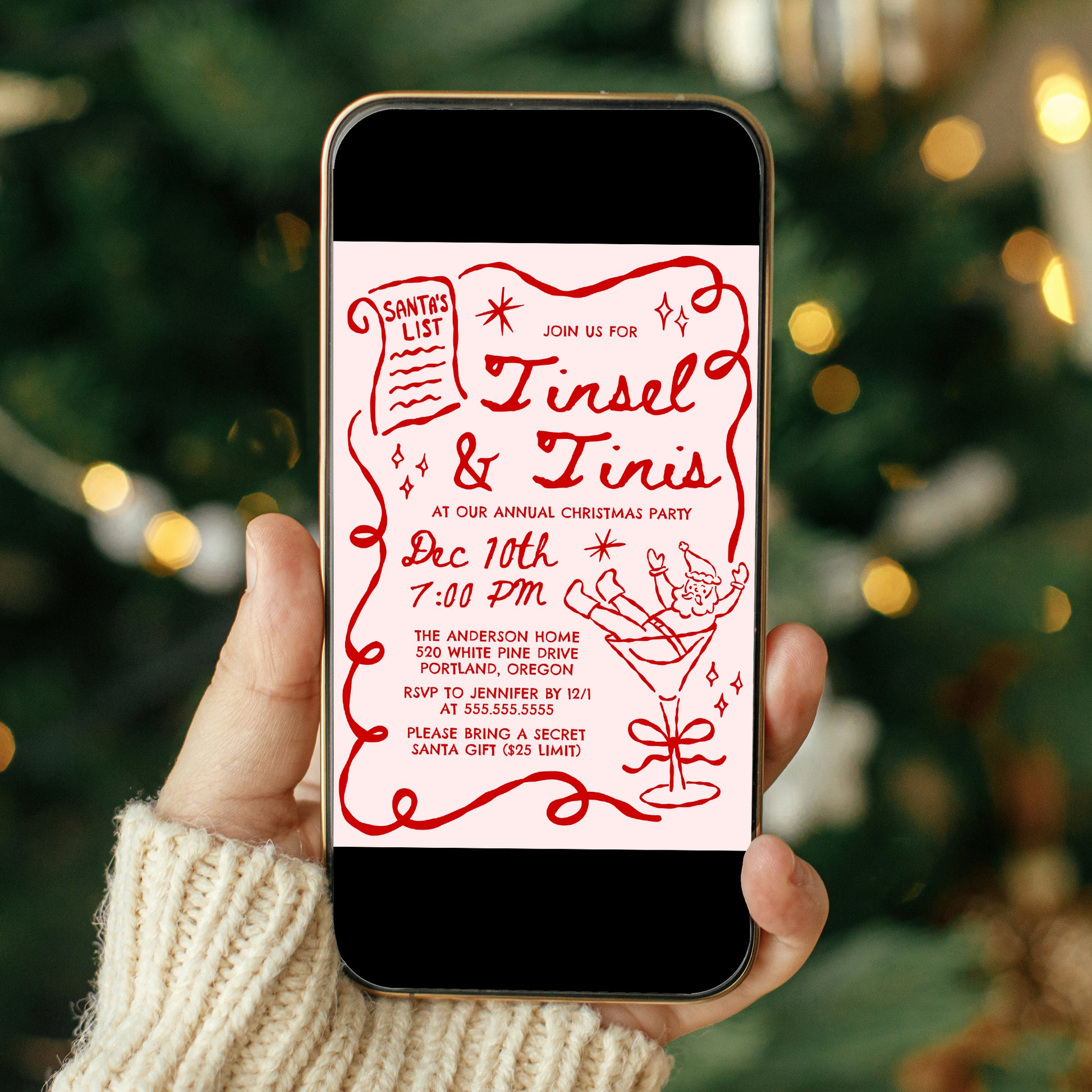 Whimsical Tinsel and Tinis Christmas Party Invitation in Pink and Red | Corjl Template